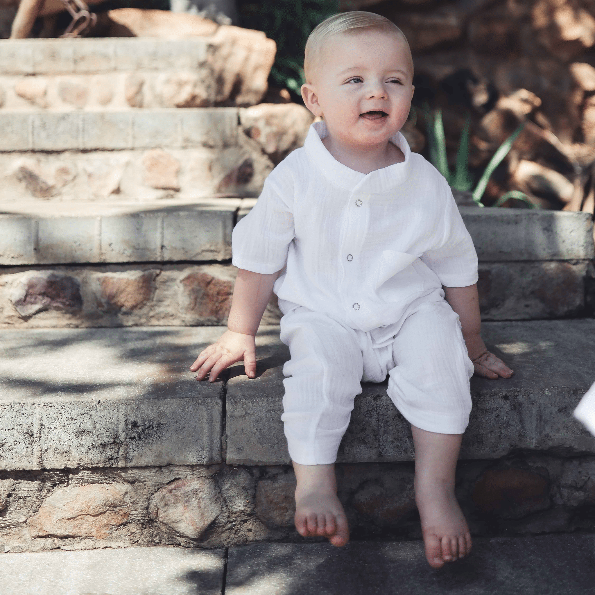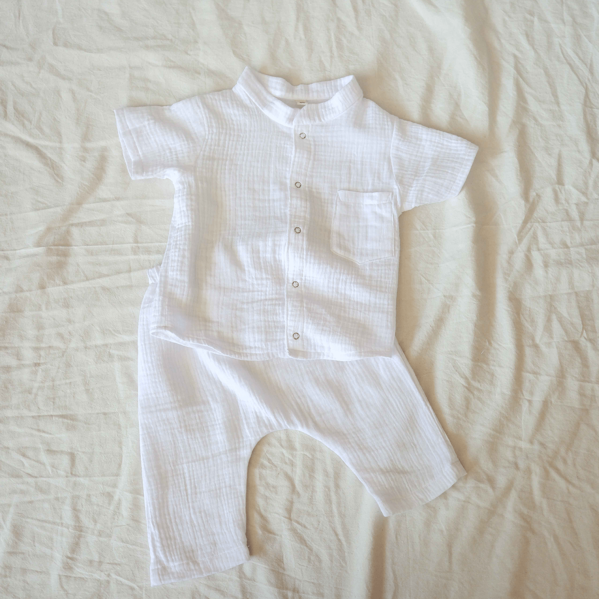 The shirt has a mandarin collar, short sleeves, features a small patch pocket on the left chest and opens with press studs. Our Gravel pants has an elasticated waist and harem style finish. Wear the pants as is or cuff the bottom hem to shorten. Keep little ones feeling stylish comfortable with this classic set.