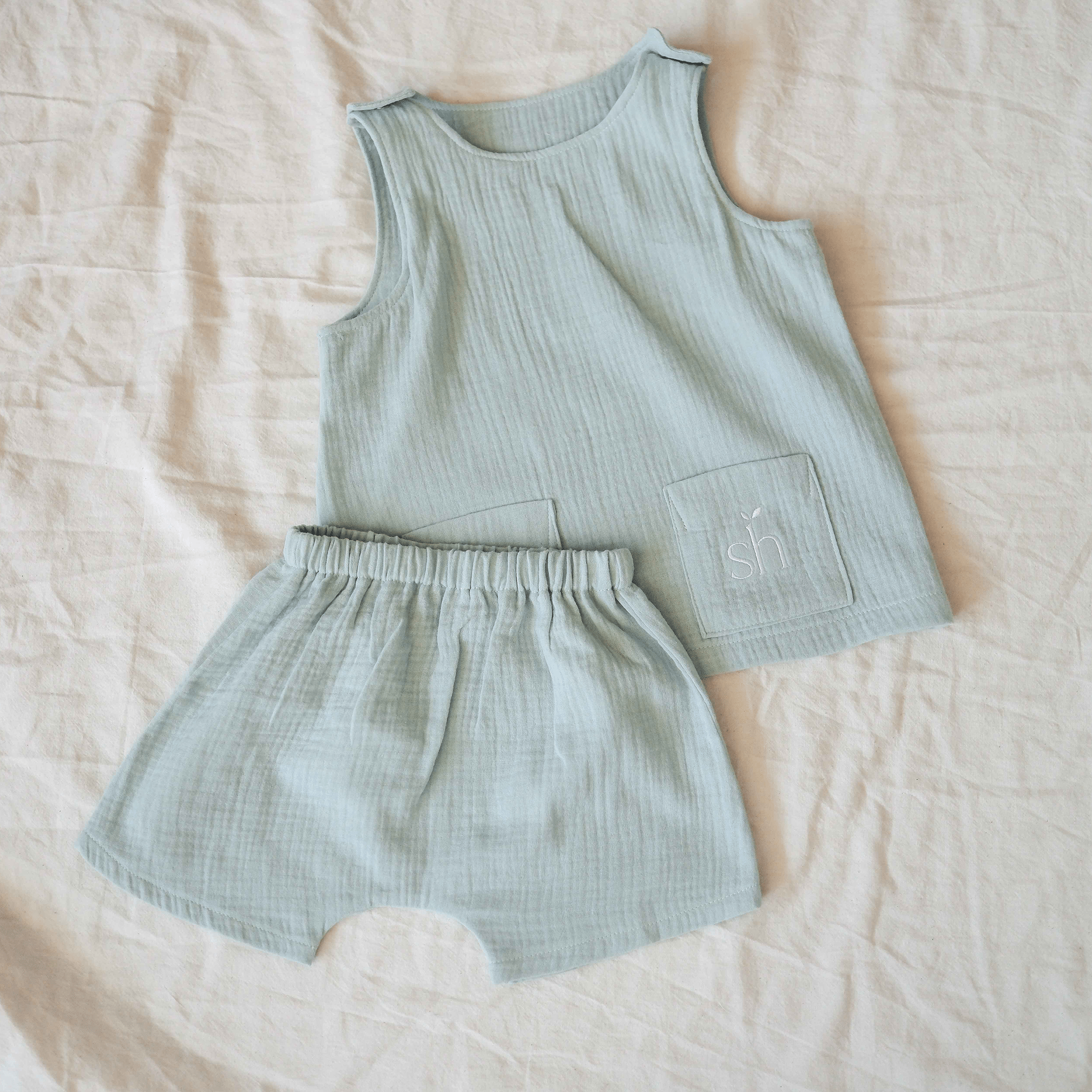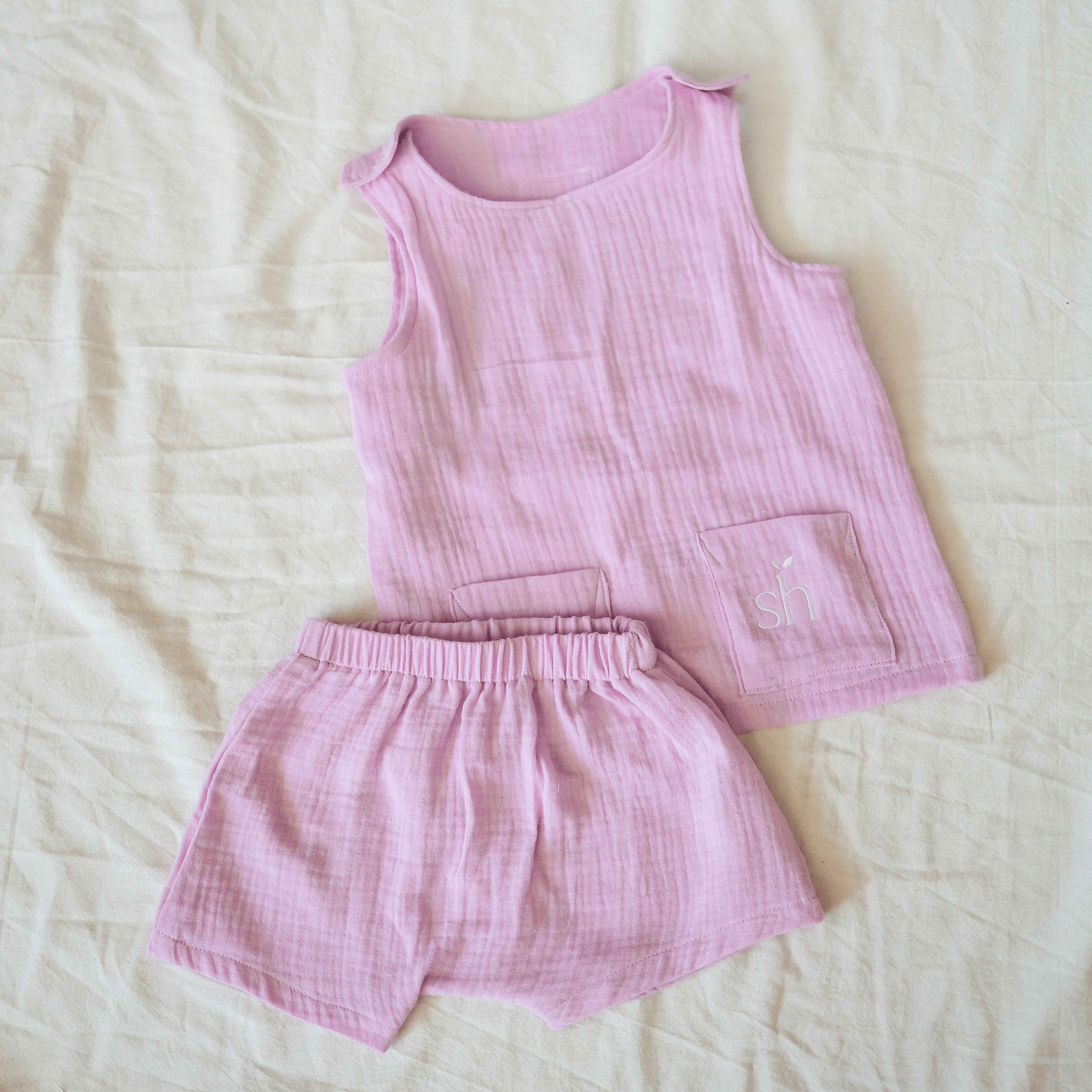 This gender neutral set is easy summer wear at it's best. The opening of the shoulders have press studs on both sides. The top features two pockets for understated detailing. The harem style short is elasticated around the waist. It's super comfortable and breathable making this set perfect for busy little bodies on hot sunny days.